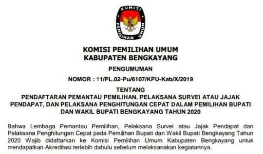 KALIMANTAN TODAY, BENGKAYANG – Komisi Pemilihan Umum (KPU) Kabupaten Bengkayang sedang melakukan berbagai tahapan persiapan menghadapi Pilkada serentak tahun 2020 di kabupaten Bengkayang. Persiapan yang mulai dilakukan diantaranya merekrut pemantau pemilihan atau pelaksanaan survei atau jajak pendapat, serta pelaksanaan penghitungan cepat. Pendaftaran dibuka mulai tanggal 1 November 2019.