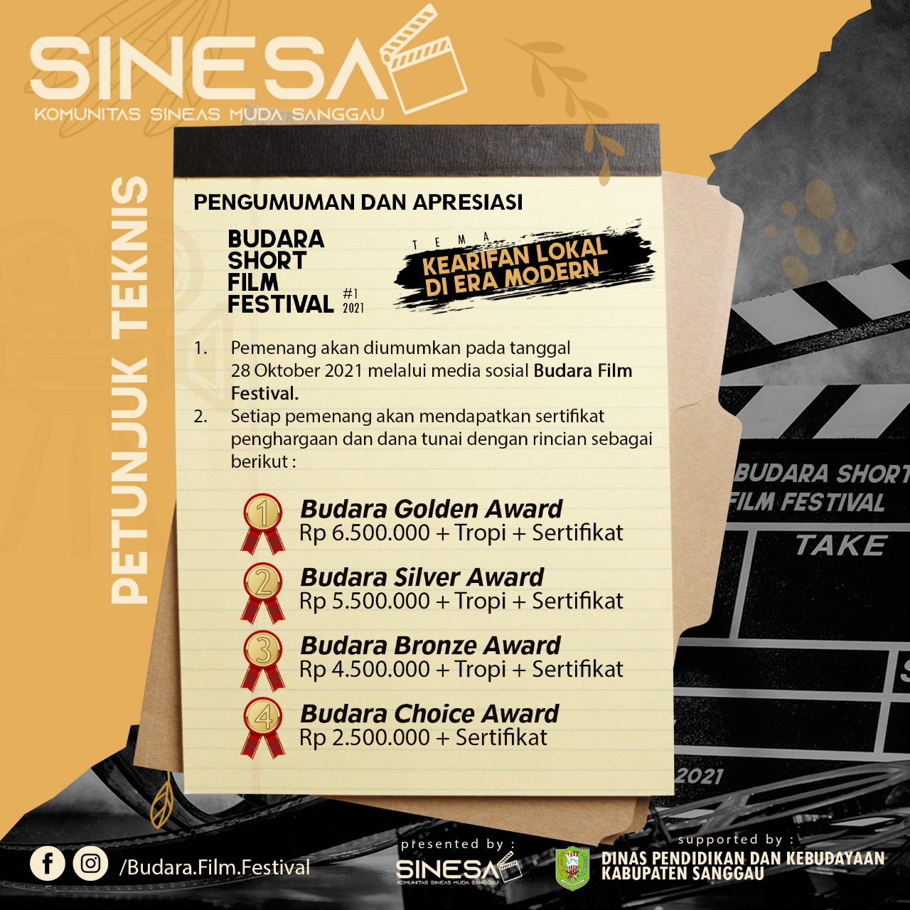 Irvan menambahkan, kegiatan ini dapat diselenggarakan atas dukungan dari Pemerintah Kabupaten Sanggau melalui Dinas Pendidikan dan Kebudayaan Kabupaten Sanggau. Adapun nama kegiatan yang diselenggarakan Komunitas Sinesa Sanggau adalah Budara Short Film Festival #1 Tahun 2021. Mengangkat tema ‘Kearifan Lokal Di Era Modern; dalam bentuk Festival Film Pendek se-Kalimantan Barat.