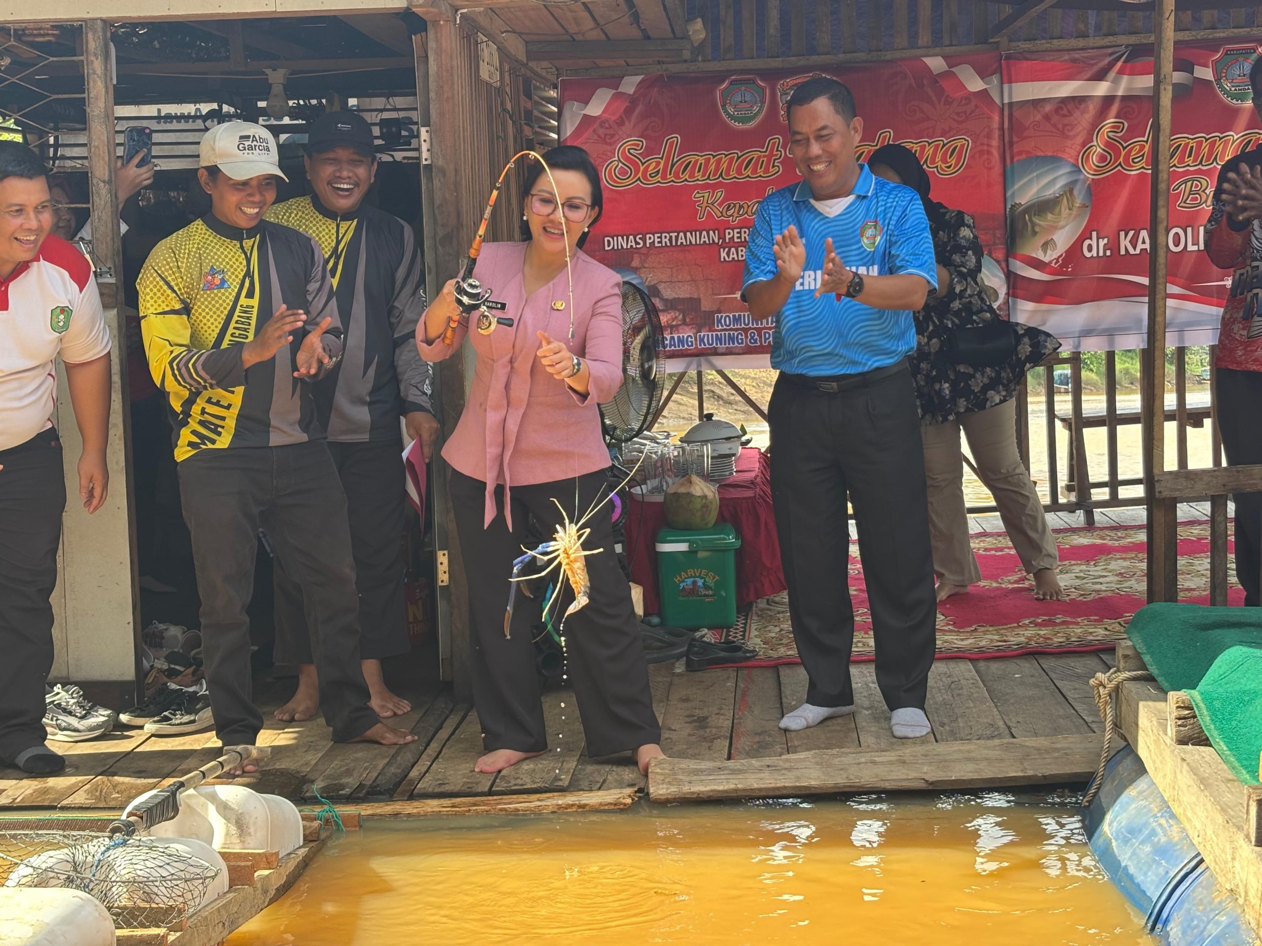 KALIMANTAN TODAY, LANDAK – Para pehobi mancing udang galah yang tergabung dalam Komunitas Pemancing Lancang Kuning, melakukan panen udang galah yang dihadiri langsung Bupati Landak Karolin Margret Natasa di Lanting Lancang Kuning, Dusun Hilir Tengah I, Desa Hilir Tengah, Kecamatan Ngabang, Jum’at (03/10/25) sore.