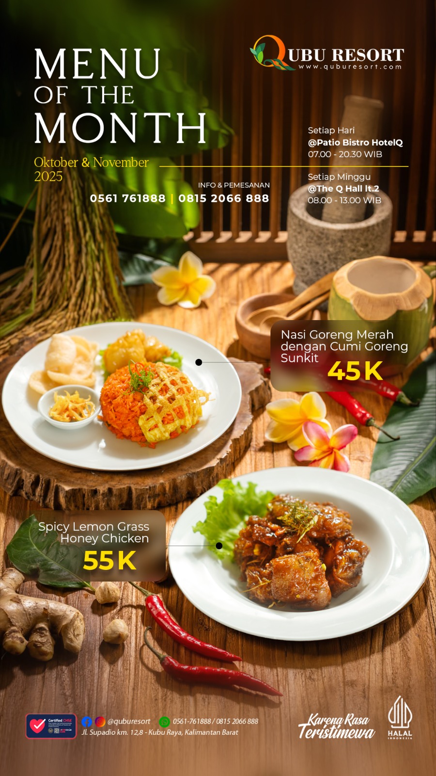 KALIMANTAN TODAY, KUBU RAYA – Qubu Resort kembali menghadirkan inovasi kuliner istimewa untuk memanjakan para tamu dengan Menu of The Month Oktober 2025. Kali ini, cita rasa khas Nusantara berpadu dengan sentuhan modern melalui Nasi Goreng Merah dengan Cumi Goreng Sunkit dan Spicy Lemongrass Honey Chicken.