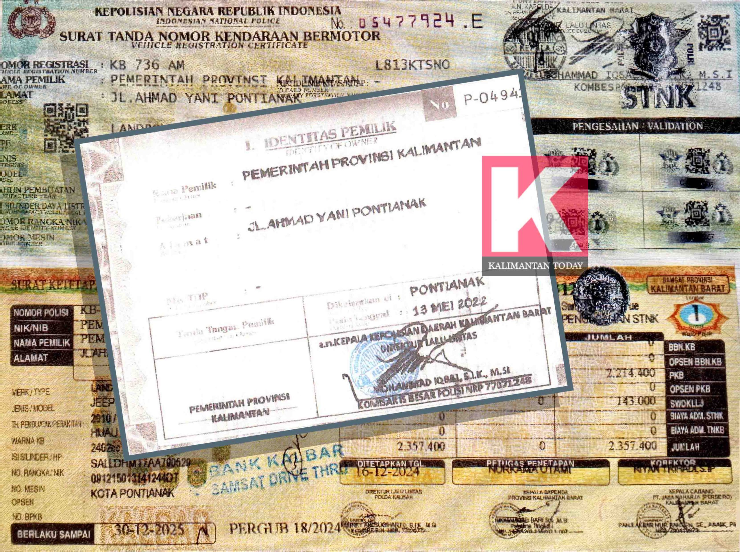 BPKB dengan nomor P-04941774 yang dikeluarkan pada 13 Mei 2022 tidak tertulis nama identitas pemilik dengan lengkap. Dalam BPKB dan STNK, keduanya tertulis atas nama Pemerintah Provinsi Kalimantan dengan alamat jalan Ahmad Yani Pontianak.