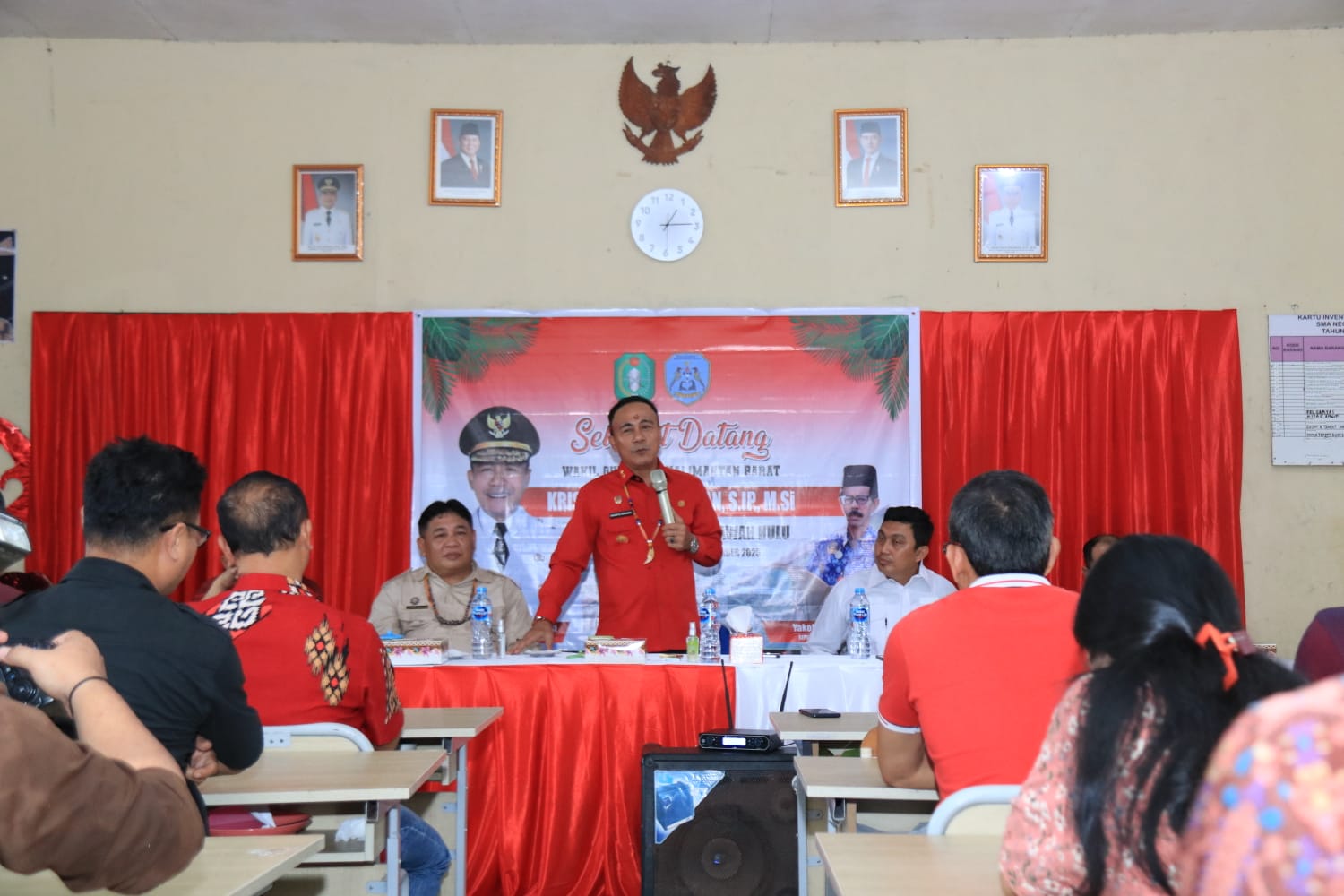 Kedatangan Wagub Krisantus dan rombongan disambut hangat oleh Kepala Sekolah, para Guru, serta perwakilan OSIS SMA Negeri 1 Mempawah Hulu.