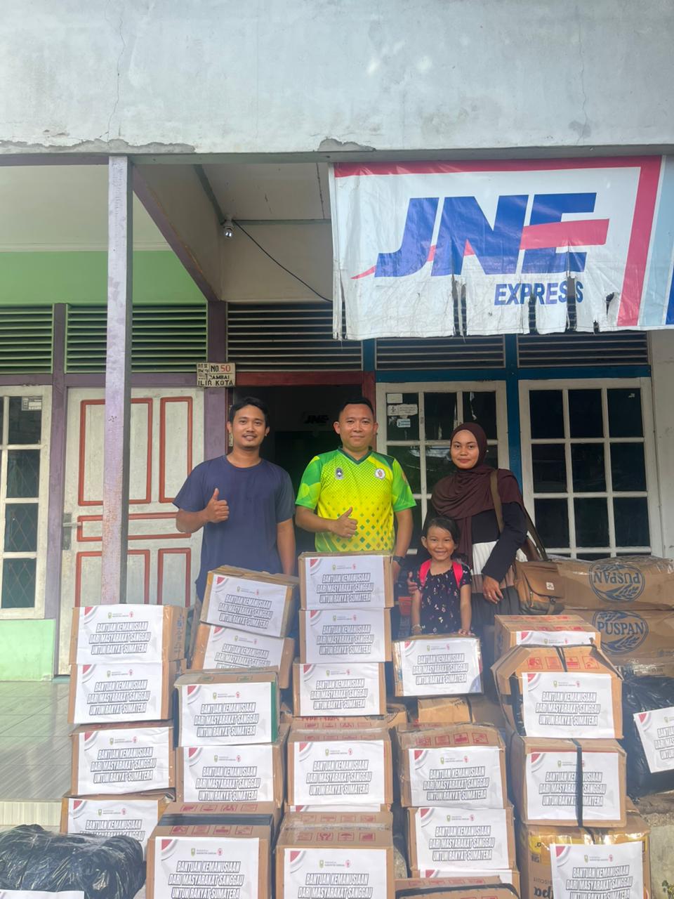 Foto—Koordinator aksi sosial masyarakat Sanggau, Rizky Kurniyawan (tengah) mengirimkan bantuan masyarakat Sanggau melalui JNE Sanggau, Jumat (05/12/2025)—ist