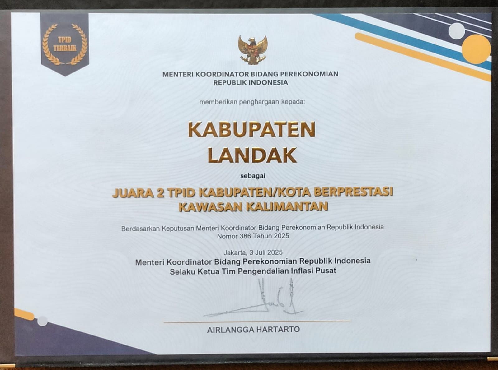 KALIMANTAN TODAY, LANDAK – Pemerintah Kabupaten Landak meraih juara 2 Tim Pengendalian Inflasi Daerah (TPID) dengan kategori Kabupaten/Kota Berprestasi Kawasan Kalimantan.